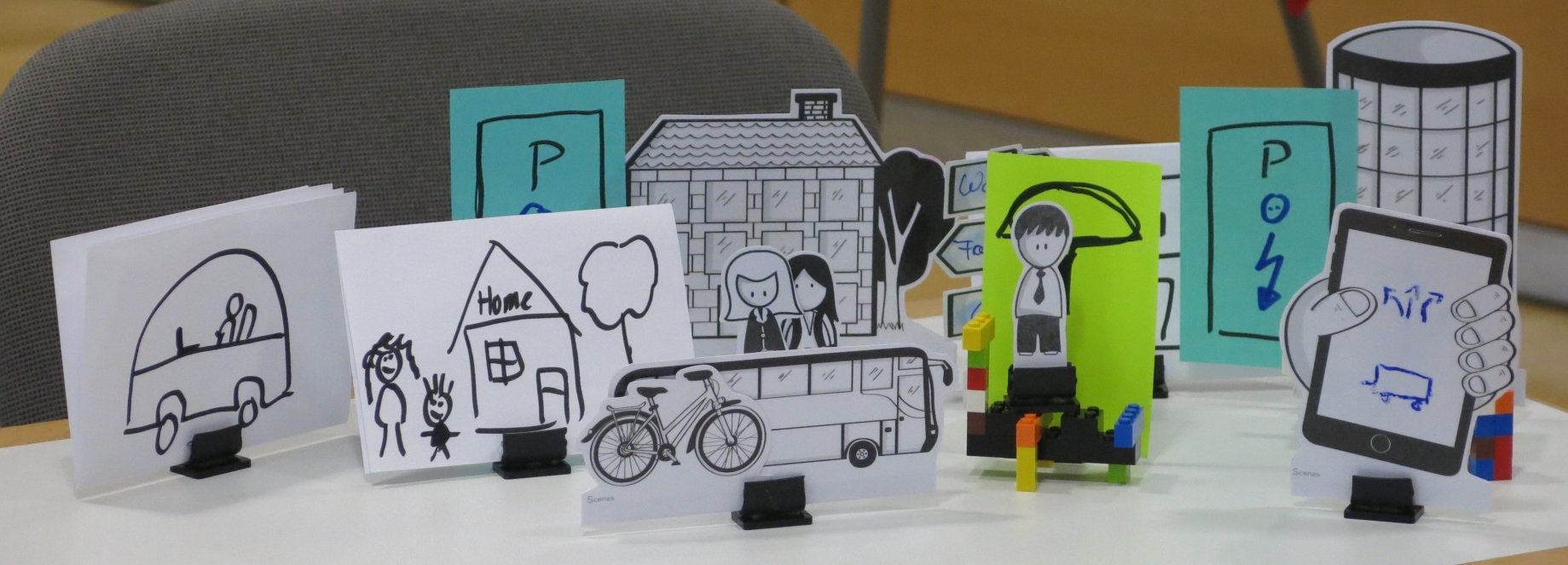 Various ideas emerged during the Ideation-Phase. We first collected them silently. After everybody has freed his mind we got together in groups and discussed the various ideas. While presenting ideas to others our participants continuously came up with new ideas. At the end of the Ideation-Phase we selected the most promising one and built a prototype during the upcoming Prototype-Phase. For prototyping we provided elements of the story telling box, Lego as well as paper materials. Beyond others prototypes were built for the following ideas: